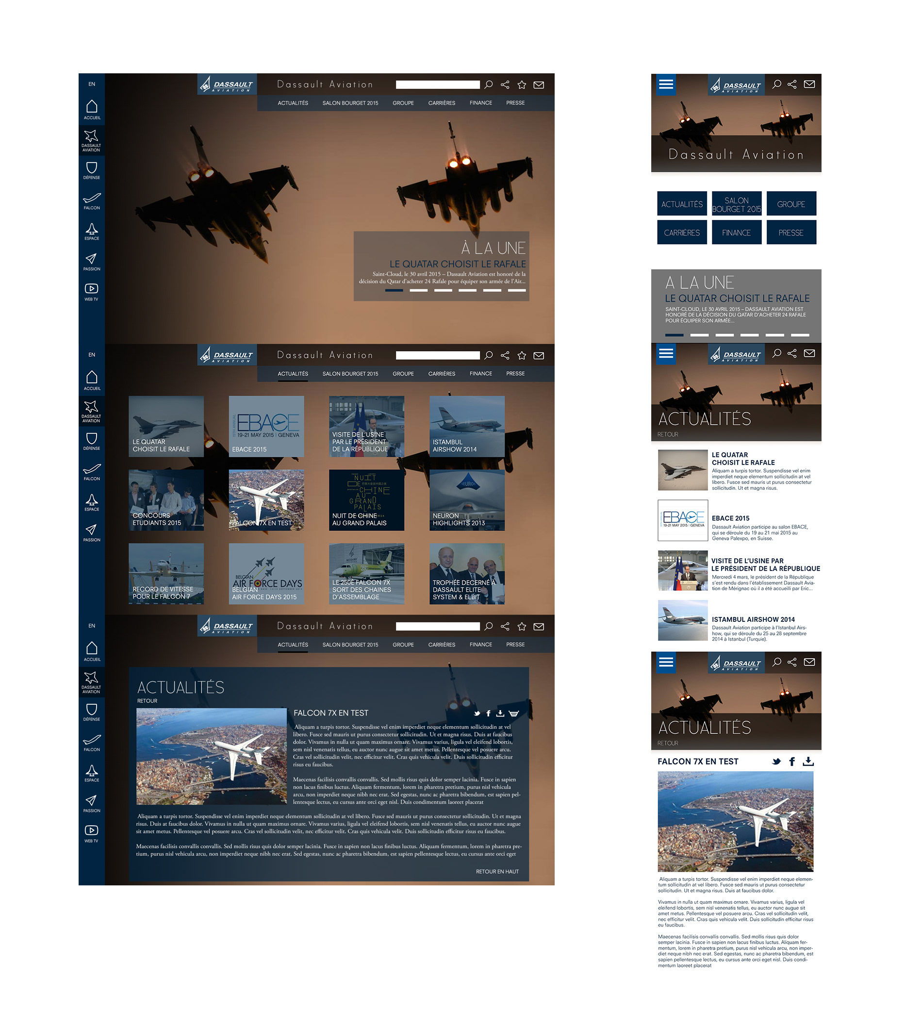 The main challenge was to keep the content of the old site while redesigning an entirely new perspective from the user's point of view. To achieve these goals, the new website would promote separate Dassault Aviation's universes (instead of just promoting Dassault Aviation the group) which would enable the user to explore and become more knowledgeable about each section or to just skip to the content relevant to him therefore giving a more broadview of Dassault Aviation and its products without losing himself in layers upon layers of content.